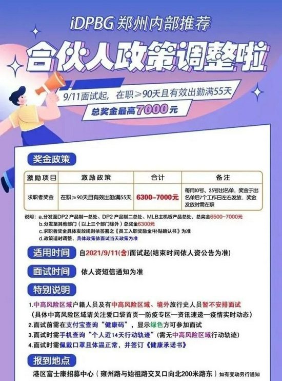 9月11日面试起,富士康郑州园区某事业群激励奖金降为7000元。图片源自公众号“郑州FOXCONN招募中心”