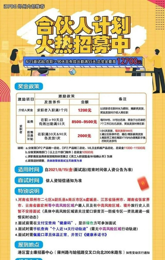 据公众号“富士康iDPBG郑州普工招募”,8月15日起,入职奖金最高12700元。