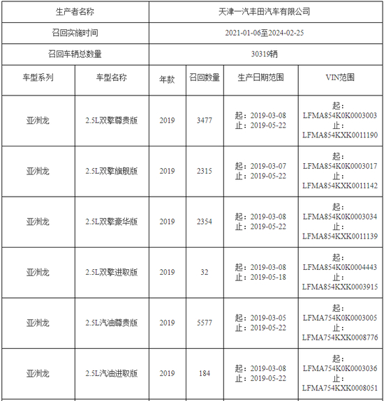 需要注意的是,此次召回涉及的亚洲龙车型,全部为搭载2.5升排量发动机的2019款燃油和混动车型,并不包括近期车主投诉的搭载2.0升排量发动机的2019款燃油版车型。