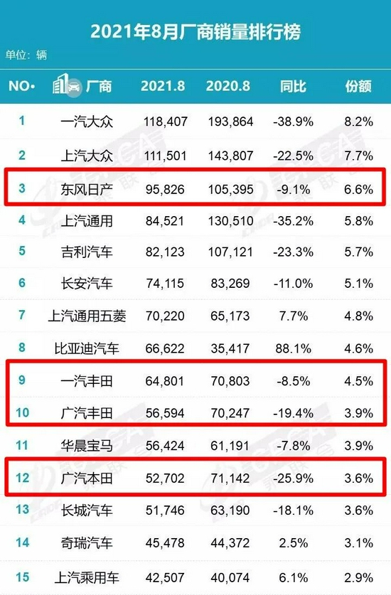 质量问题层出不穷,加上芯片短缺等因素,丰田品牌的销量也呈下滑趋势。乘联会公布的2021年8月销量数据显示,一汽丰田的销量为64801辆,同比下滑8.5%。其中,从其热门车型来看,卡罗拉当月销量下滑达30.5%。而广汽丰田、广汽本田、东风日产等日系车厂商的当月销量也出现下滑,而一汽马自达更是在此期间消失在了历史的长河之中。