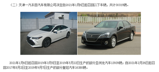 实际上,在2020年11月6日,一汽丰田方面曾宣布召回13939辆亚洲龙汽车,召回原因为:“由于供应商在低压燃油泵叶轮的制造过程中,树脂成型条件存在不完善,导致叶轮树脂密度不足。叶轮可能会受燃油影响而发生膨润变形,与低压燃油泵壳体发生干涉,导致低压燃油泵工作不良,极端情况下,可能会出现车辆无法正常启动或行驶中发动机熄火的情况,存在安全隐患。”