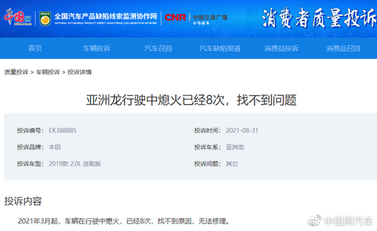 据中国网汽车频道报道,魏先生的2019款亚洲龙2.0L进取版汽车多次出现行驶中发动机突然熄火的问题。