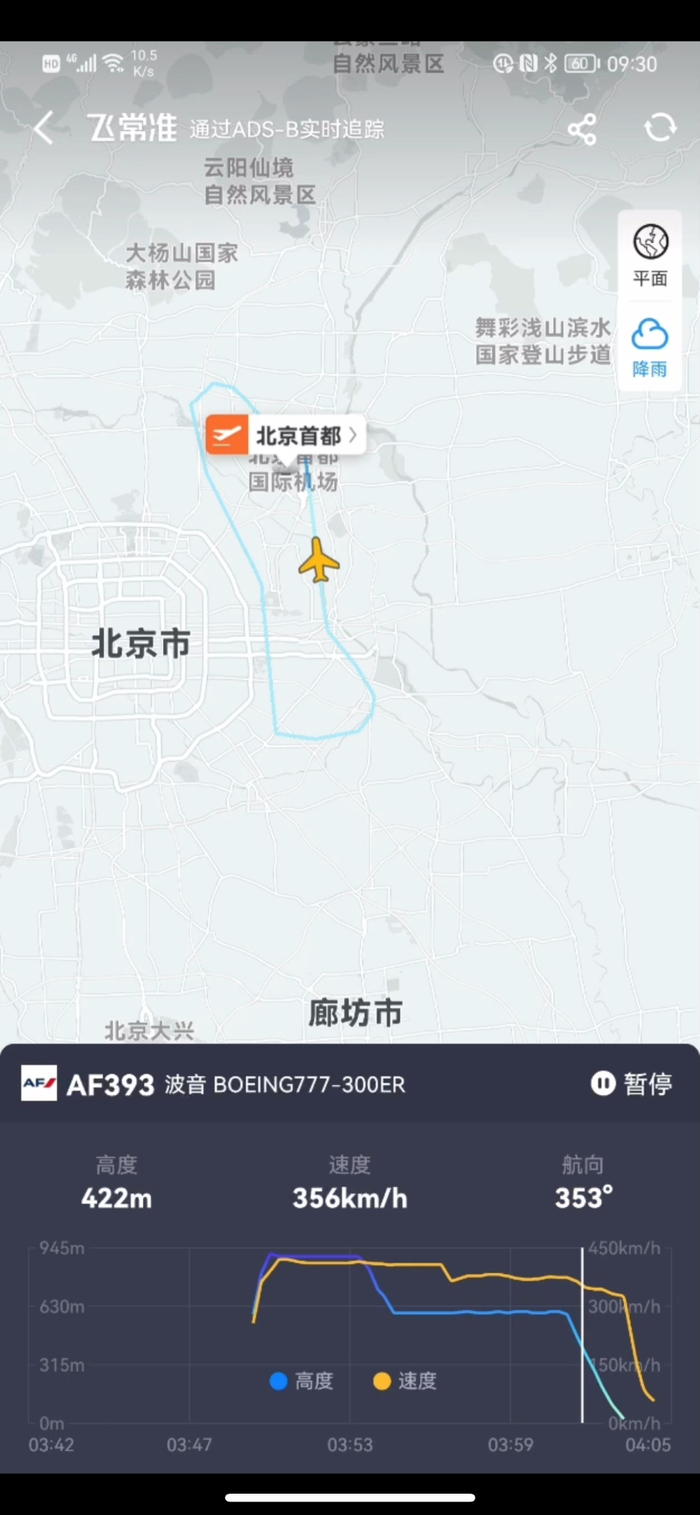 飞常准APP显示,法航AF393(北京首都-巴黎戴高乐)原计划9月18日02:30起飞,实际起飞时间03:47,于04:04返回北京首都机场,全程飞行17分钟。
