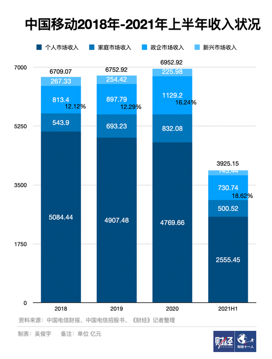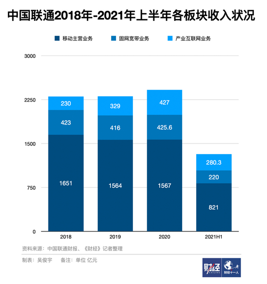 2021年上半年,中国电信的移动通信、宽带固网收入2020年-2021年的收入甚至不及2019年。中国移动个人通信业务在2018年-2020年逐年下滑。中国联通移动主营业务在2019年一度收入下滑,2020年恢复增长后依旧低于2018年,固网宽带业务则是增长几乎停滞。