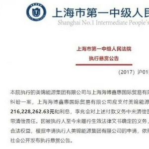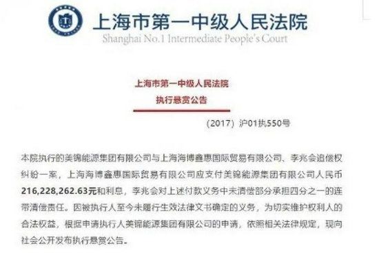 《华夏时报》记者从这份公告中了解到,上海一中院执行的美锦能源集团有限公司(下称“美锦能源”)与上海海博鑫惠国际贸易有限公司(下称“海博鑫惠”)、李兆会追偿权纠纷一案,海博鑫惠应支付美锦能源人民币216,228,262.63元和利息,李兆会对上述付款义务中未清偿部分承担四分之一的连带清偿责任。因被执行人至今未履行生效法律文书确定的义务,依照相关法律规定,法院向社会公开发布执行悬赏公告。