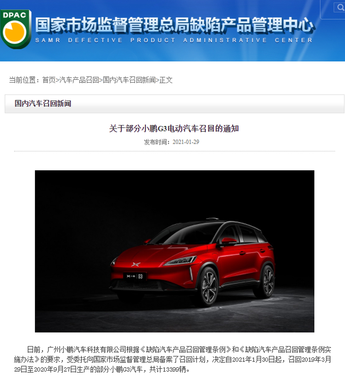 除了质量投诉及自燃事故外,今年1月份,小鹏G3还曾因车载逆变器直流母线电容上连接铜排螺丝的镀锡端子锡须,造成高压直流电正负极间短路,进而引发辆启动失败而发起召回,召回车辆共计13399辆。