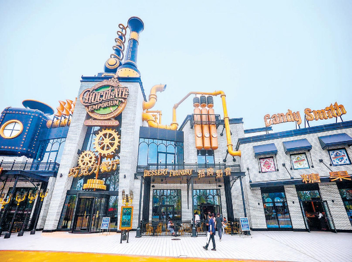 环球度假区城市大道内造型独特的巧克力主题餐厅。