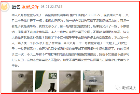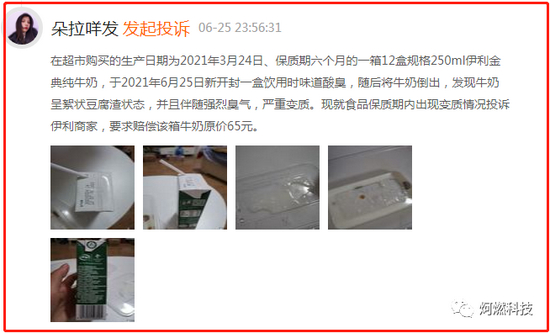 6月25日,一名叫@朵拉咩发的网友通过平台投诉,其在超市购买的生产日期为2021年3月24日、保质期六个月的一箱12盒规格250ml伊利金典纯牛奶,于2021年6月25日新开封一盒饮用时味道酸臭,随后将牛奶倒出,发现牛奶呈絮状豆腐渣状态,并且伴随强烈臭气,严重变质。
