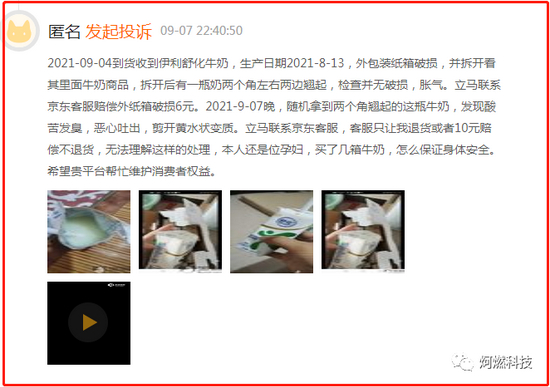 9月7日,另一位消费者称,其从京东购买了伊利舒化牛奶,9月4日到货,生产日期2021年8月13日,外包装纸箱破损,拆开看其里面牛奶商品,拆开后有一瓶奶两个角左右两边翘起,检查并无破损,胀气,9月7日,他随机拿到两个角翘起的一瓶牛奶,发现酸苦发臭,恶心吐出,剪开黄水状变质。