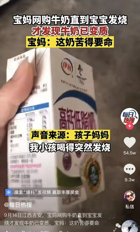 江西宝妈杨女士在某电商平台上买到了味道发苦、水乳分离的伊利牛奶,经媒体报道后引发关注。