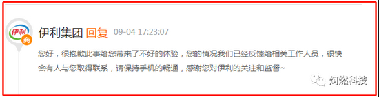 伊利方面的回复是:我们已经反馈给相关工作人员,很快会有人与您取得联系...