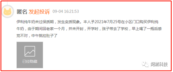 例如,9月4日,一位消费者通过新浪“黑猫投诉”称,他于2021年7月25号在小区门口购买伊利纯牛奶,由于期间回老家一个月,并未开封,开学时,孩子带去了学校,早上喝了一瓶后感觉不对,中午就拉肚子了。