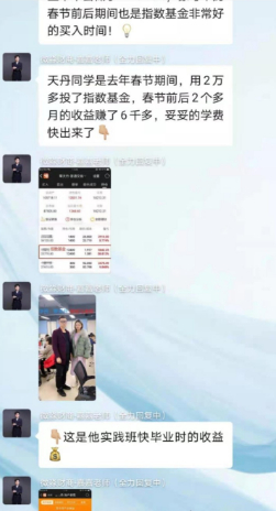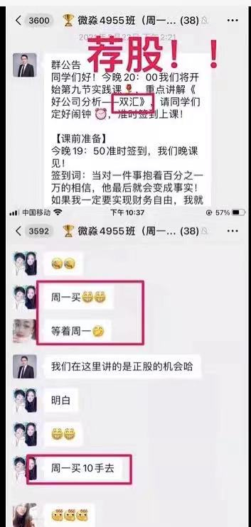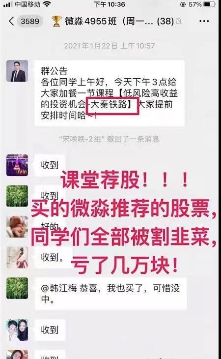 有学员表示,在学完股票投资之后,微淼老师就开始在班里打着实践课或者是加餐课的名义推荐股票,将股票渲染成“低风险高收益的投资机会”。