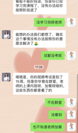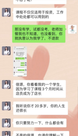 同样的事情还发生在郭小姐身上,但与之前两人的遭遇不同的是,郭小姐没有学完想办理退学费,与郭小姐沟通的老师开始答应退费,但后来以课程内容都发群里为由,认定郭小姐已经学过课程不予退款,之后又游说称她有学生学习了课程3个月时间从店员成为了店长。郭小姐认为老师在胡搅蛮缠,不解决问题。