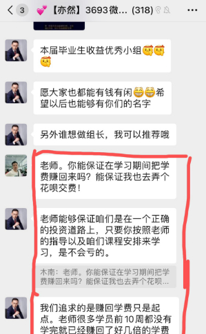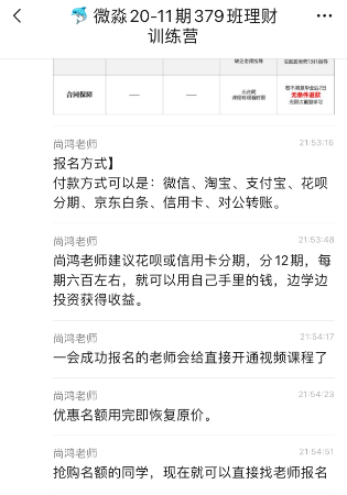 一位微淼学员告诉时代数据,他曾参加了微淼小白理财课,在课程快结束时,微淼老师就在群里卖力推荐6998元的进阶课程,同时明确建议学员使用花呗或信用卡分期支付,这样就可以用自己手里的钱边学边投资边收益。