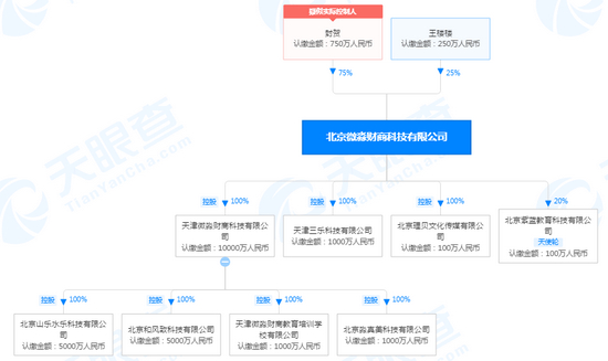 另据天眼查显示,北京微淼财商科技有限公司由封贺和王楼楼两人共同成立,封贺是公司的实际控制人,占股75%;王楼楼是公司的法定代表人,占股25%。公司旗下有子公司4家、孙公司4家。其中,真正具有教育资质的是孙公司天津微淼财商教育培训学校有限公司,拥有营利性民办职业技能培训机构的资质许可,该公司成立于2021年2月20日。这也意味着,在今年2月20日之前,微淼商学院也并无办学资质。