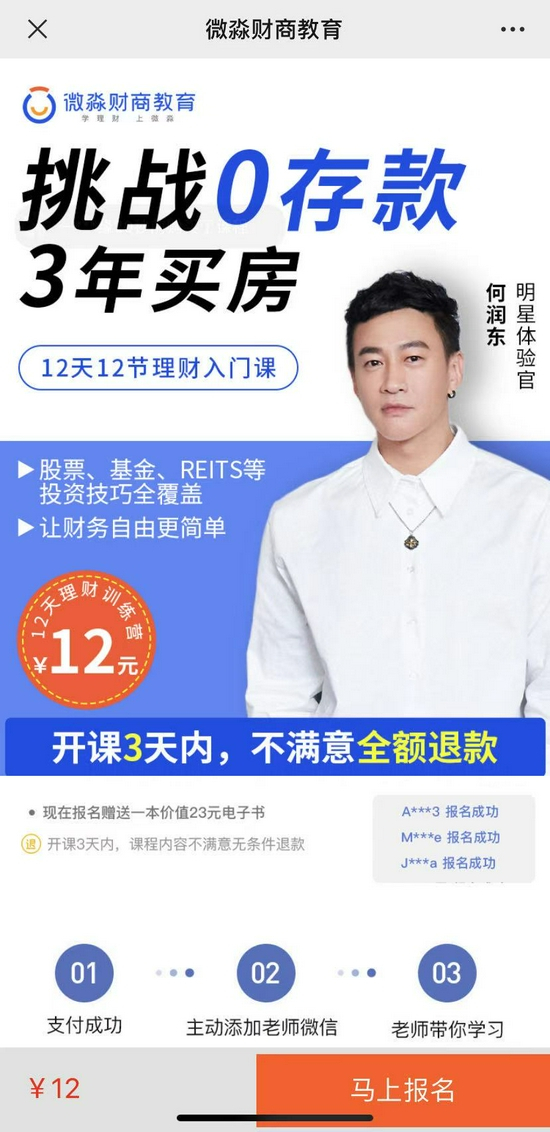 “你想过不靠工资如何赚到100万吗”、“掌握富人思维,拥有‘睡后收入’”、“12元学理财,做个有钱人”……