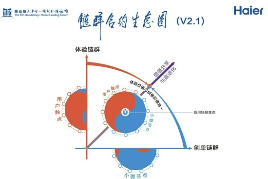链群合约的生态是完全颠覆了科层制的。过去是研发、制造、是销售、售后、人力等部门,但现在变成一个个小微,小微围着用户转,聚合成链群。一类叫做体验链群,就是直接和用户接触的;一类叫做创单链群,是创造用户价值的。体验链群发现用户的一个需求,与创单链群融合,创单链群创造后,马上感知用户体验,根据用户反馈迭代优化,这也体现了零距离。这中间没有层级汇报。所以,链群合约,既是一个创造性的破坏,也是创造性的重组。