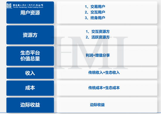 比如,第一个是用户资源,海尔要创造终身用户。传统三张表没有用户,只有顾客。产品卖出去交易就完成了。第二个是资源方,海尔和生态中所有的资源方一起共创用户体验。传统报表里体现的只有分供方,是供货关系。更重要的是第三个——生态价值,传统三张表里没有生态价值,只有产品价值。生态价值需要的就是场景和生态。第四第五个是收入和成本,传统报表里有产品收入和产品成本,但没有生态收入和生态成本。最后,最重要的是边际收益。传统损益表里边际收益一定是递减的,这是传统经济学的一个核心,每台产品利润肯定是越来越低,但是海尔可以实现边际收益递增。因为是在不断地创造新生态,而且这是零摩擦的市场,和用户之间是零距离。