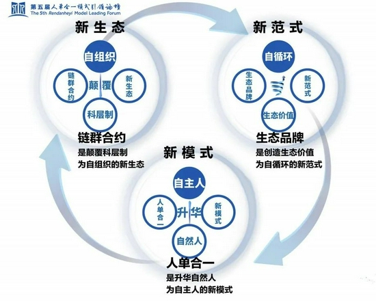 “三自”对应“三新”。第一个“新”是新模式,以人单合一为基础的新模式。第二个“新”是新生态,以链群合约为基础的新生态,第三个“新”是新范式,是以生态品牌为基础的新范式。