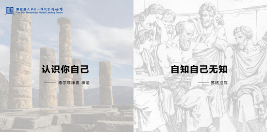 “认识你自己”是被称为西方哲学之父的泰勒斯所说的,但是真正被熟知是因为苏格拉底。苏格拉底的朋友到这个神庙去求神谕,得到的是说苏格拉底是最有智慧的人。苏格拉底听后遍访希腊当时非常有智慧的名人去求证,但发现所有人都认为自己有某方面的智慧,所以苏格拉底最后得出一个结论,就是之所以他被认为有智慧,是因为他“自知自己无知”。苏格拉底从来没有想要提出什么新的思想,而是要成为新思想的助产士,帮助别人产出新思想。所以,今天所讲的这一切,就是要让每个人把自己的潜在能力都发挥出来,实现德鲁克所说的,让每个人成为自己的CEO。