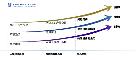 第四次工业革命已经到来,这对全世界都是一个非常大的挑战,在这个挑战当中,要么自我进化,与时代共生存;要么就自我僵化,被时代所淘汰。其标志就是能不能创造出生态品牌。生态品牌不是一个简单的产品品牌,而是一个物联网范式体系。