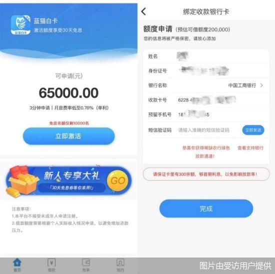 据王洋介绍,9月13日,其在浏览网页信息时,关注到一个名为“蓝猫白卡”的借款平台,声称可以低息贷款。通过网页展示的下载链接,王洋下载安装了蓝猫白卡App。