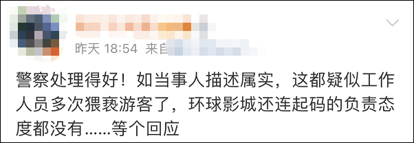 (观察者网讯)昨天(25日),网友@我不爱吃肉啊meat 发帖爆料称,近日,她在环球影城游玩期间,被疑似是环球影城工作人员的男子掀裙底偷拍,自己报警之后,该男子被拘留10天。这名网友表示,事发后,环球影城“处理此事不积极也没道歉”,只是让她们再去免费玩一天,她的诉求是环球影城公开道歉。