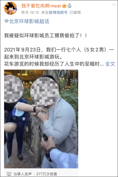 3、民警带偷拍男去做笔录后,曾叮嘱女生一行其他人和环球工作人员配合调查,可“环球服务处领班人表示心痛你的遭遇,但无能为力,交涉了将近半小时,安保和宾客服务互相推脱踢皮球。”后来,她们又想让工作人员或安保人员一起去警察局处理此事,也遭到拒绝。