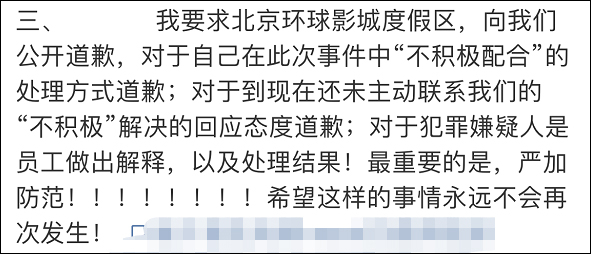 4、工作人员姗姗来迟到了警察局,“不道歉不作为,说同为女员工,只能对我们的遭遇深深理解同情,最后才缓缓给出了愿意让我们几个人换一天再来环球影城的解决结果。”但她不想再去了。