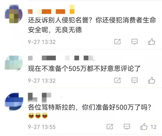 对此,网友也热议纷纷。“现在不准备个500万都不好意思评论了”、“往后兜里没505万,咱不敢来给特斯拉评论,太吓人啦”、“各位骂特斯拉的,你们准备好505万了吗”、“还反诉别人侵犯名誉?你还侵犯消费者生命安全呢”......