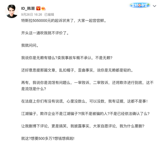 9月26日,特斯拉退一赔三胜诉车主韩先生发表微博表示,自己没有收到赔偿款,反而收到了来自特斯拉的一纸诉状。特斯拉方面称,韩先生在过去一年时间里,使用“垃圾”、“无赖”、“流氓”等形容特斯拉企业及其产品,其行为已经严重侵害了特斯拉公司的法人名誉权,要求索赔共计505万元。