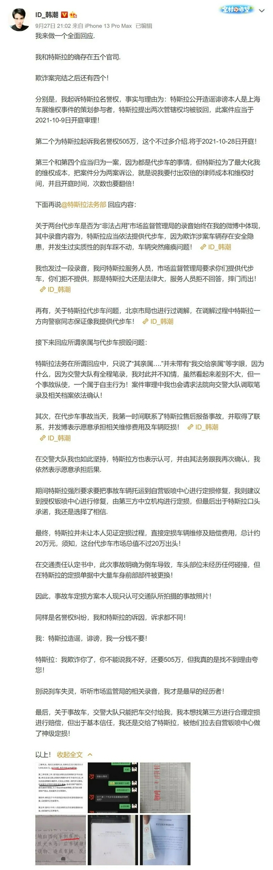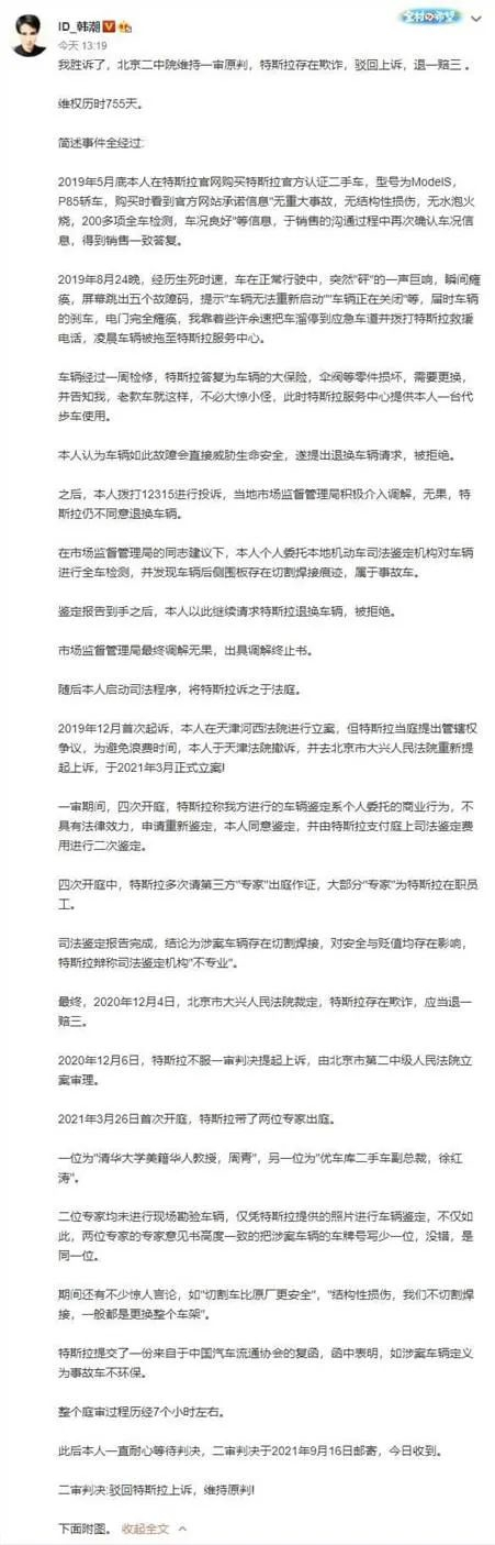 与此同时,面对特斯拉法务部9月27日对双方的五件官司向媒体的回应,韩先生再次发表微博表示,和特斯拉的确存在五个官司,欺诈案完结之后还有四个,并表示第三个和第四个应当归为一案,但特斯拉为了最大化其维权成本,把案件分为两案诉讼,就是说我要付出双倍的律师成本和维权时间,并且开庭时间,次数也要翻倍,此外,韩潮还在微博解释了代步车事故的问题。