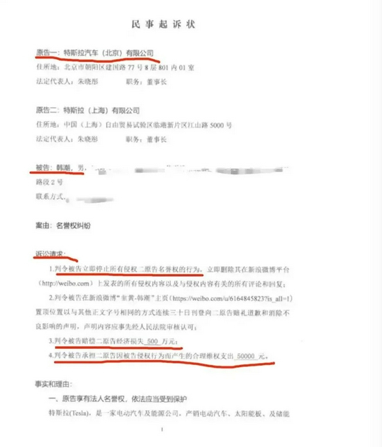 特斯拉方面有四点诉讼请求:一是判令被告立即停止侵权行为,立即删除其在新浪微博平台上发表的所有侵权内容以及与侵权内容有关的所有评论和回复;二是判令韩潮在个人微博置顶30日向两名原告赔礼道歉和消除不良影响的声明;三是判令韩潮赔偿二原告经济损失500万元;四是判令被告承担二原告的合理维权支出5万元,合计索赔505万元。