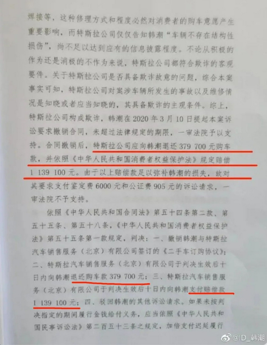 经过半年多时间,北京二中院给出了最后的判定:特斯拉在向韩潮销售案涉车辆时存在欺诈行为,上诉请求“不能成立,予以驳回”,一审判决则“应予维持”。特斯拉需退一赔三,包括退还37.97万元购车款,以及赔偿113.91万元。