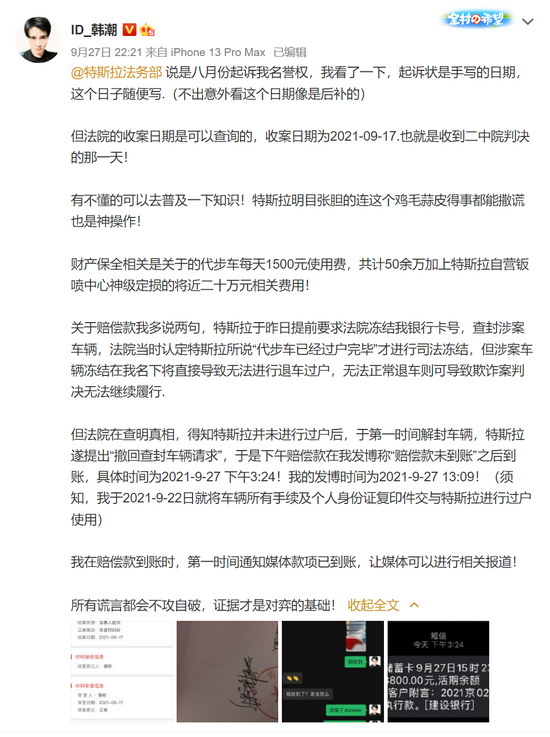 与此同时,韩潮在9月27日发布的微博中称,特斯拉说是八月份起诉其名誉权,但起诉状是手写的日期,这个日子随便写(不出意外看这个日期像是后补的)。但法院的收案日期是可以查询的,收案日期为 2021-09-17,也就是收到二中院判决的那一天。