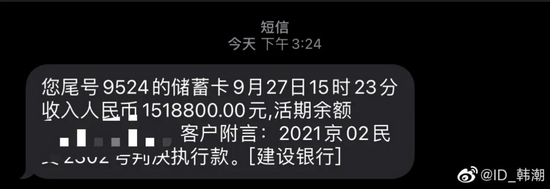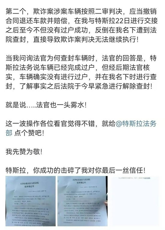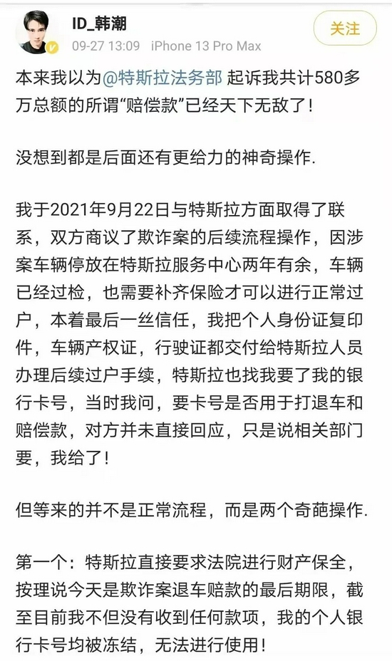但此后,韩先生在微博表示,“不但没有收到任何款项,我的个人银行卡号均被冻结,无法进行使用!”“在我与特斯拉22日进行交接之后至今不但没有过户成功,反倒在我名下遭到法院查封,直接导致欺诈案判决无法继续执行!”