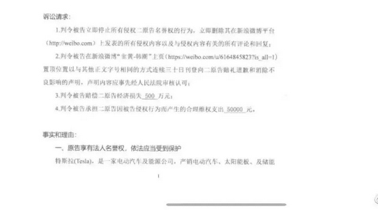 特斯拉以“侵犯名誉权”为由,要求法院判令韩先生删除其在新浪微博平台上发布的侵权内容以及相关回复,而且要在微博刊登道歉声明并置顶30日,并要求韩先生作出500万元人民币的赔偿,以及承担5万元的诉讼费用。
