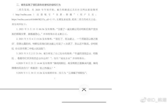 特斯拉方面表示,车主韩某从2020年初开始通过新浪微博个人账号长期发表诋毁、贬低特斯拉的相关言论,比如“无赖公司”、“说了n次谎了”、“牛逼的流氓企业”、“辣鸡特斯拉”、“江湖骗子特斯拉”等用词形容特斯拉企业及其产品,其行为已经严重侵害了特斯拉公司的法人名誉权。