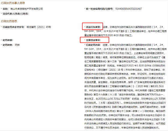 原标题:佛山卓滨地产公司违法施工遭处罚 大股东为卓越集团