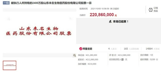 根据淘宝拍卖的公告显示,此次拍卖的为限售流通股,其中2400万股未名医药股票一宗,占未名医药总股本3.64%,起拍价2.1288亿元,保证金为2128万元,增价幅度21万元。