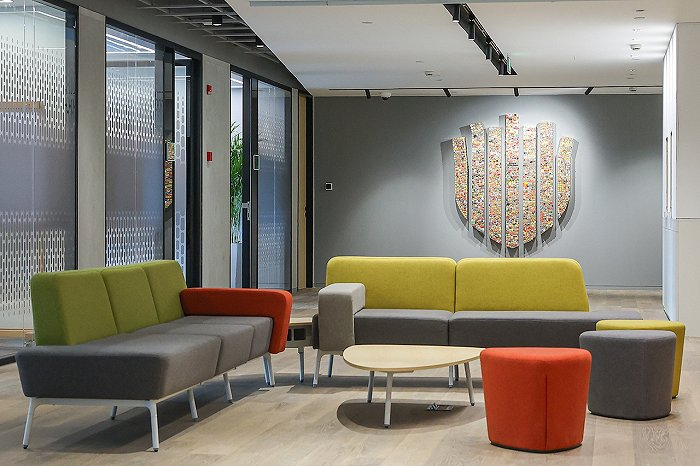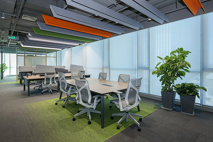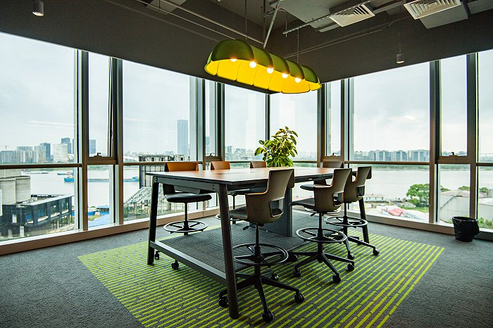界面新闻实地走访发现,“巨无霸魔方”内采用的是当下颇为流行的“以办公事务为基础”(Activity-based Working)的移动办公模式;即为员工没有固定工位,可以按照需求在多达8种不同工位选择,流动办公。此外,所有的办公楼层都拥有“团队之家”(Team Home)的区域,可以让不同部门的员工进行交流沟通。