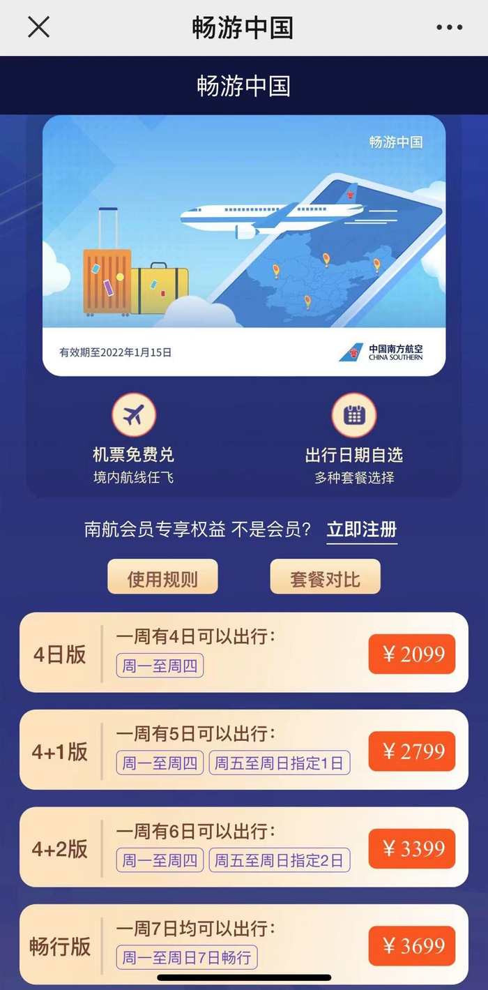 南航快乐飞一期、二期主打卖点就是“打卡美好中国”,三期产品也延续该核心,取名为“畅游中国——无限飞行,打卡美好中国”,共包含四个版本套餐产品。
