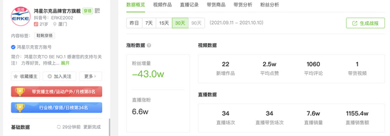 截至10月11日,据飞瓜数据,近30天以来,鸿星尔克品牌官方抖音直播间“直播涨粉”6.6万,但同期内“掉粉”43万。与此同时,近一周内,直播间累计9场直播的销售额不到300万元。