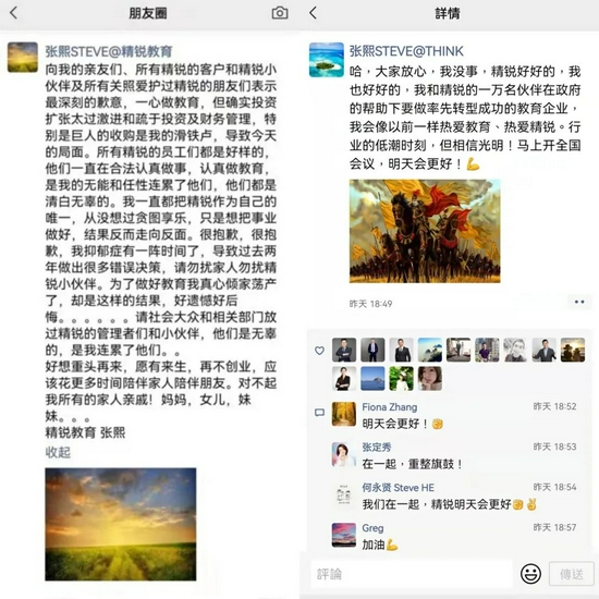 也正是这次“两张截图事件”引发后续精锐教育连锁反应。据经济观察网报道,有精锐员工表示,“此前我们的校区还能维持基本运营,一些费用也可以退还给家长。除去这部分,愿意留在精锐继续上课的家长和学员也能保证公司有正常流水。但7日张熙两条消息一出,整个学校就崩掉了。”