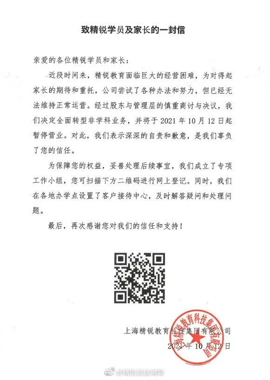 10月12日下午,精锐教育发布“致精锐学员及家长的一封信”。信中称,近段时间精锐面临巨大经营困难,公司尝试各种努力仍无法维持正常运营。经股东与管理层商议,决定全面转型非学科业务,并将于12日起暂停营业。
