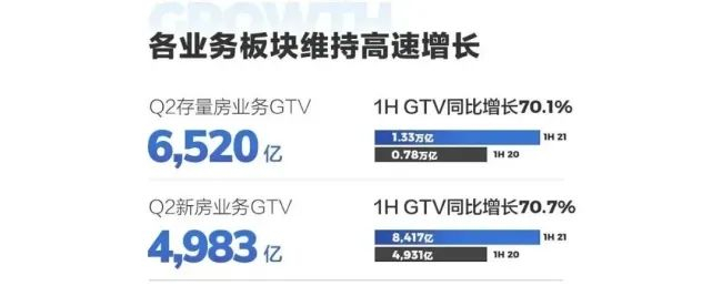 比如,根据公开数据,上半年,存量房市场交易额同比增长41%,同期贝壳存量交易GTV同比增长70.1%;全国新房交易额同比增长39%;贝壳新房交易GTV同比增长70.7%。