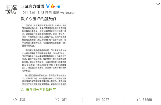 对于上述风波,玉泽发布声明表示,玉泽得到李佳琦的推荐和认可,一直心怀感恩。由于大量知乎、小红书不知来源的指责,对玉泽已经造成困扰,面对攻击感到无助。在声明最后,品牌也提到,作为国货他们近20年发展不易,一个谣言对他们影响很深,所以只能恳请大家停止以讹传讹。