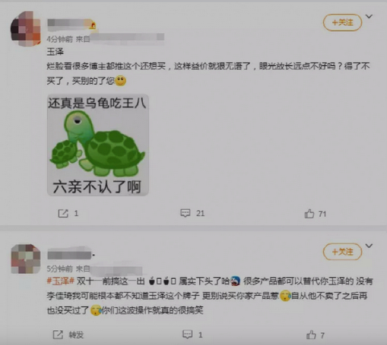 他们的行为看似有些疯狂。据一些网传截图显示,有李佳琦粉丝冲入薇娅直播间,直指玉泽是“背叛”。许多粉丝起诉玉泽“疯狂涨价之后去薇娅那里搞活动,一手好牌打烂”。在他们眼中,玉泽是李佳琦“捧红”的国产品牌,本次合作终止是玉泽“过河拆桥”。