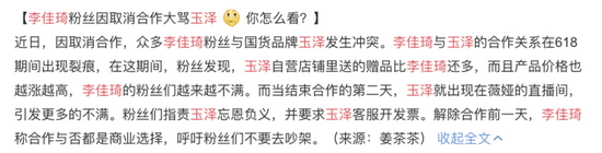 可惜双方的合作好景不长,几个月后,李佳琦的直播间里不再出现玉泽产品。有李佳琦的粉丝直言称,原因是因为玉泽产品无故涨价了,而且店铺直播间送的赠品比此前李佳琦直播间的更多。相关言论风起,众人对玉泽表示不满。